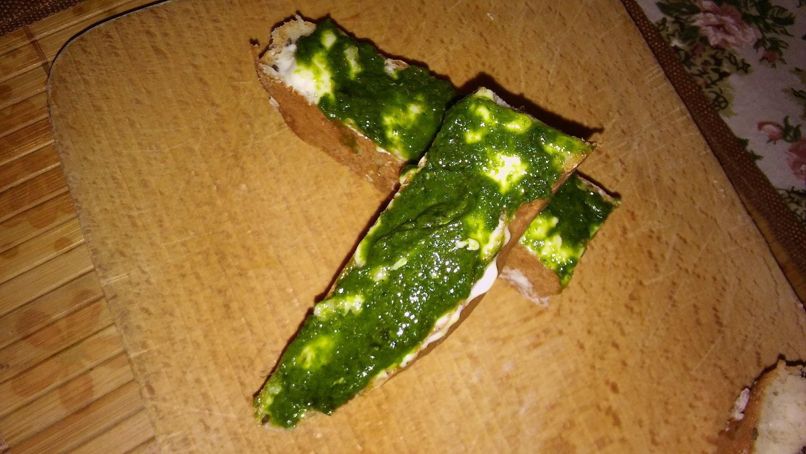 zavislost...moj spaldovy chlebik s lan.semienkami s natierkovym syrom a s pestom z medv.cesnaku