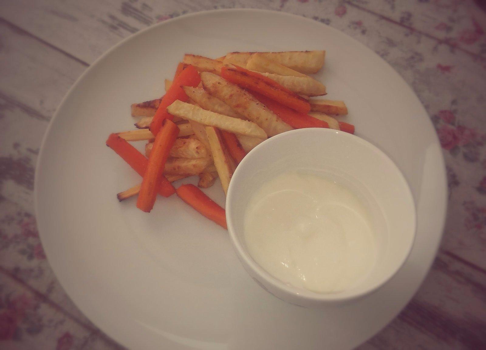 Hranolky z mrkvy,zeleru a petrzlenu s jogurtom