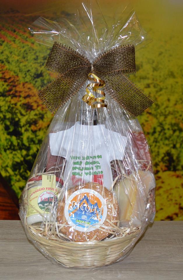 Darčekový kôš plný syrov a salámov. Obsahuje kvalitné biele šumivé víno, tričko s vtipným blahoželaním, udenú riccottu, roztierateľný ovčí syr, syr Grana Padano, prošuto dolce, salám Sopressa so zeleným korením. Cena cca: 30 € (záleží na váhe)