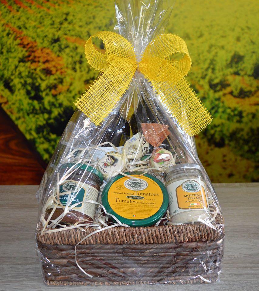 Darčekový kôš. V tmavohnedom košíku je zabalené kvalitné víno, extra panenský olivový olej, bonbóny, nakladané grilovane paradajky, artičoková nátierka, olivy, pasta z čiernych olív, ...Cena cca: 30 € (záleží na obsahu košíka a na dohode s klientom)