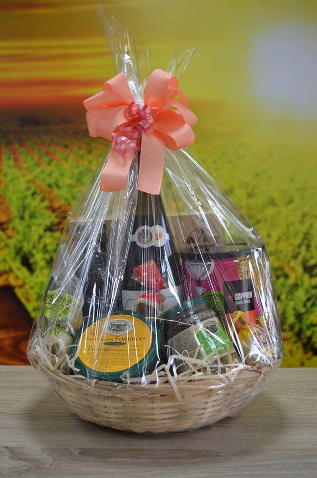 Darčekový kôš pre ženu . V krásnom košíku je zabalené kvalitné víno, bonbóny, kvalitná káva, nakladané grilované paradajky, bazalkové pesto, extra panenský olivový olej, sardínsky chlieb, olivy. Cena cca: 40 € (záleží na obsahu košíka)