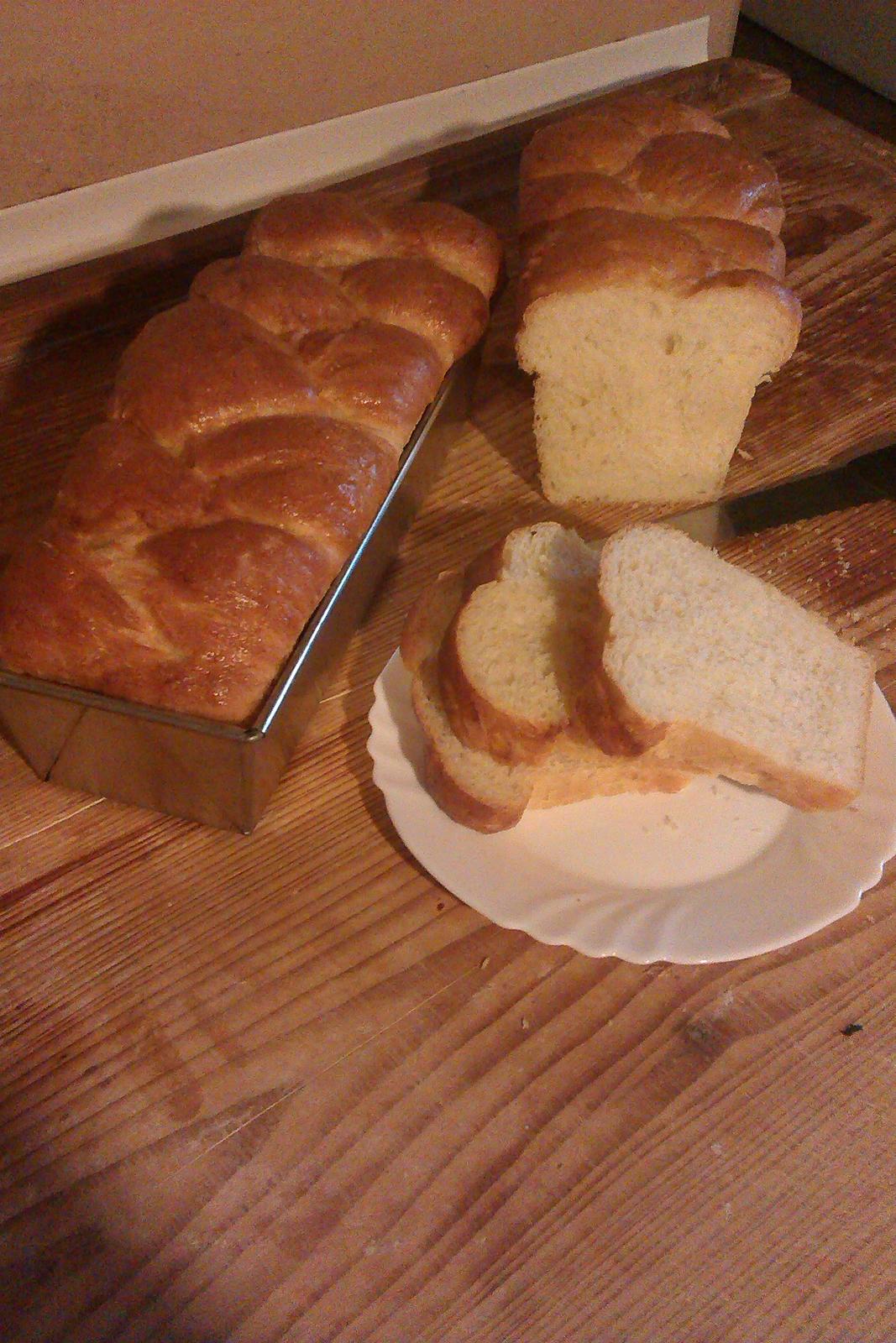 Takto pripravené cesto rozvaľkáme na doske a prerežeme na dve časti. Jednú časť prerežeme na tri časti a rozvaľkáme na okrúhle pásiky a prepletieme ako vrkoč. Preložíme do vopred vymastenej a vysypanej múkou truhlice takto spravené obe cestá. Necháme podkysnúť 40 - 45 minút už v truhlici.