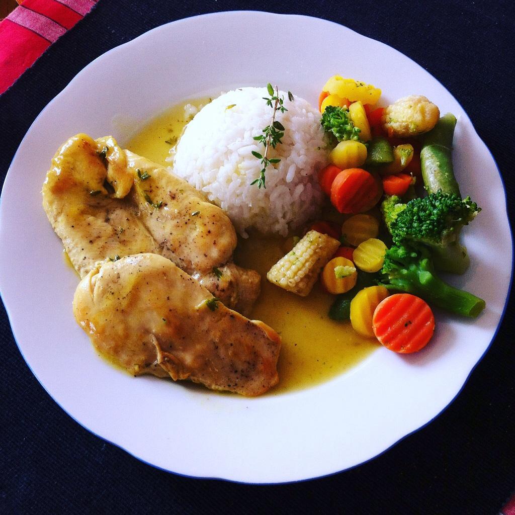 Kuracie prsia umyt osušit nakorenit ( kurkuma , sol , popor) opiect z kazdej strany na olivovom oleji posílat vodou a dusit rychlovka a mnam 🙂