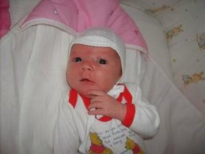 tak uz mam skoro 8 tyzdnov pribrala som od narodenia 2 kila a narastla 5 cm to som ale riadna babizna🙂 uz mam 3,5 mesiacika som velmi sikovnucka udrzim uz hracku chvilku v rucicke a viete co???objavila som si aj svoje rucicky.to je zabava cely den si ich obzerat.Uz mam 4,5 mesiacika.som velikansky papkac mam cez 8 kil som velmi sikovnucka uz sa pretacam viem sa uz aj trosku hrat a stale sa len usmievam.som velmi spokojne babetko
