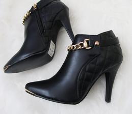 Dámske kotníčky so zlatou kovou špicou, výška podpätku cca 9,5-10cm, farba: čierna, ekokoža, veľkosti 35,36,37,38,39,40