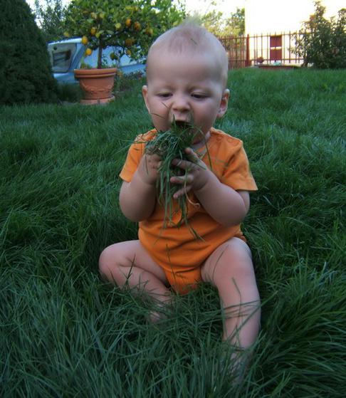 Ešte pooblizuje nachystané bratove špinavé formičky, čo mal včera v pieskovisku, a môžeme ísť von. Kým je v kočíku, všetko fičí, ako má. Okúpaný, prebalený, v čistučkom oblečení, dokonca aj kočík vyzerá byť vydrhnutý, no páni... Ale snáď si nemyslíte, že starý desaťmesačný špunt vydrží sedieť v kočíku... No určite, ešte treba pár teplákov zodrať, kým behať začnem, mama, daj ma dolu!!! Mmm, piesok, mmm hlina, mmmm, tráva, púpava, ďatelina... to sú mi veci! Bude aj dezert?