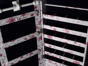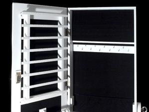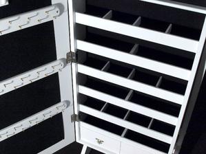 Skriňové zrkadlo obsahuje mnoho závesov na náhrdelníky, náušnice a náramky, šuplíky na malovátka a iné dievčenské a dámske drobnosti.
