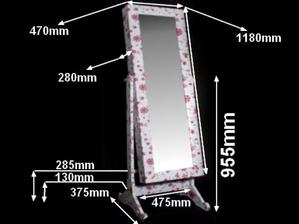 Rozmery samotného zrkadla: výška 118 cm, šíře 28cm. Rozmery vrátane stojanu, sú: výška 145cm, šíře 37cm. Dodávame rozložené.