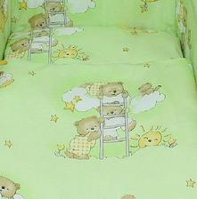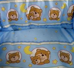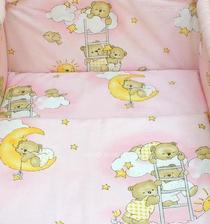Štvordielna súprava do postieľky obsahuje obliečky na paplónik, vankúš, mantinel a baldachýn.