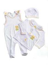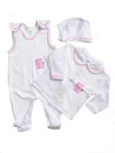 Táto biela trojdielna súprava sa skladá z kabátika, dupačiek a čiapočky. Potlač macka je doplnená farebnou krajkou. Vhodné aj na krst.
