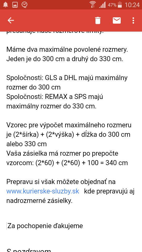 @barrborka ano ale tam je ina sadzba. Nie ta ista. Aj na SK poste a aj u klasickych kurierov remax dpd a podobne platia pravidla rozmerove ako som prilozila mail vyssie. Je to original od postoveho kuriera ktory zastupuje viac kurierskych spolocnosti ze pri vacsich rozmeroch mam vyuzit tie kurierske sluzby kde posta uz ale vychadzala okolo 20e