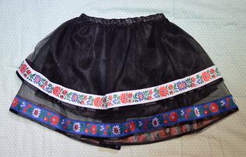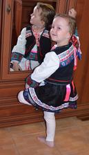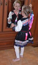 ... dá sa povedať, že je to taký recyklovaný výsledok teda kroj, lebo košeľu a vestu som dostala od synovca a pôvodne ich ušila moja teta, sukničku tylovú som kúpila hotovú tu od jednej maminky na MK a na zásterku som použila madeirovú blúzku od mojej sestry - mašle vo farbách na Xenkyne želanie a vyšívané stuhy som kúpila v galantérii - tie vyšívané boli ale poriadne drahé, takže už chápem prečo sa niektoré kroje predávajú aj za tisíc €, ak som ja vybrala tie najlacnejšie aké mali v ponuke a stáli 12€.