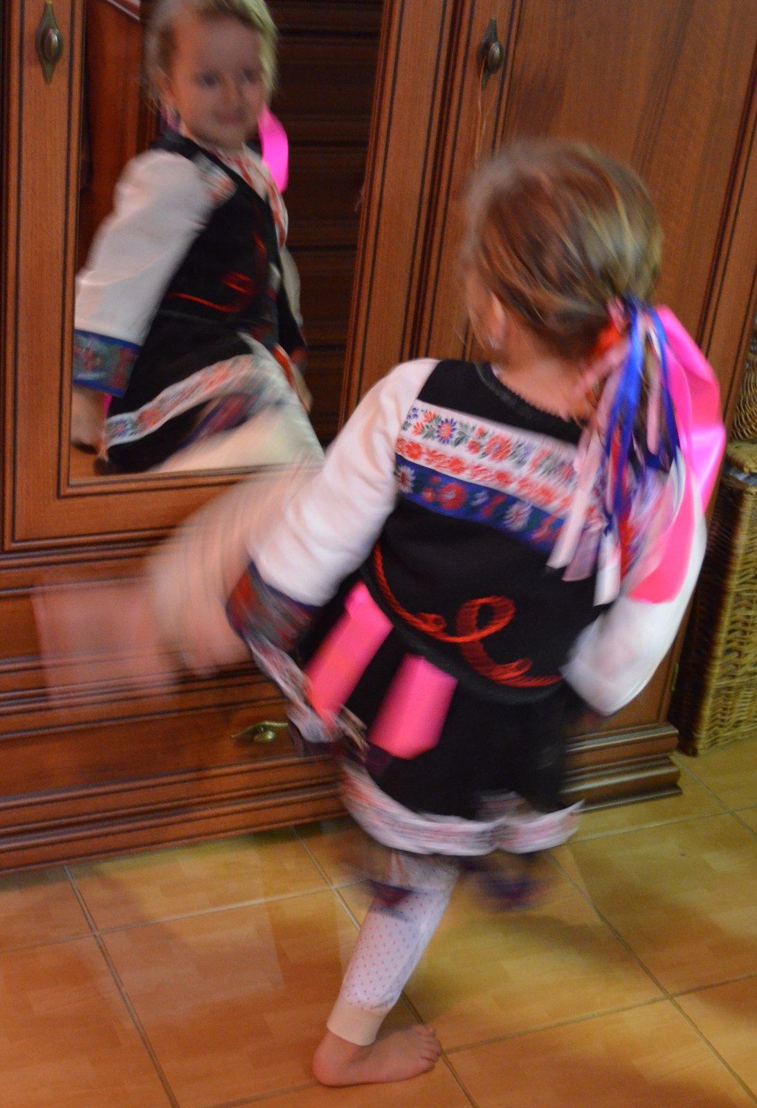 Skúšobná verzia kroja pred dokončením - Xenky je v pyžame lebo vyšla z vane :-))))