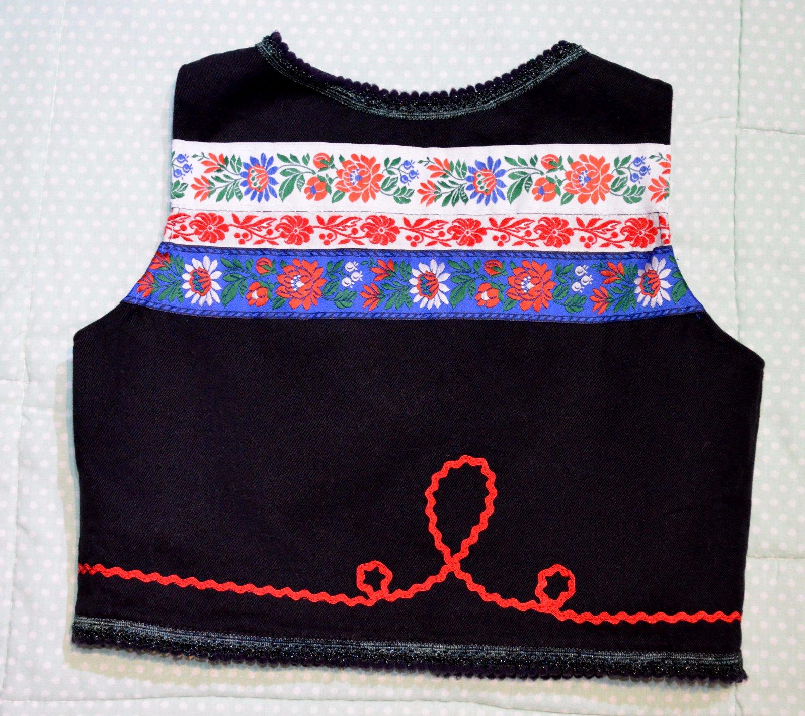 hotová nová verzia vynovená pre dievčatko pridaním vyšívaných stúh a ozdobnej bambuľkovej lemovky po celom obvode vestičky