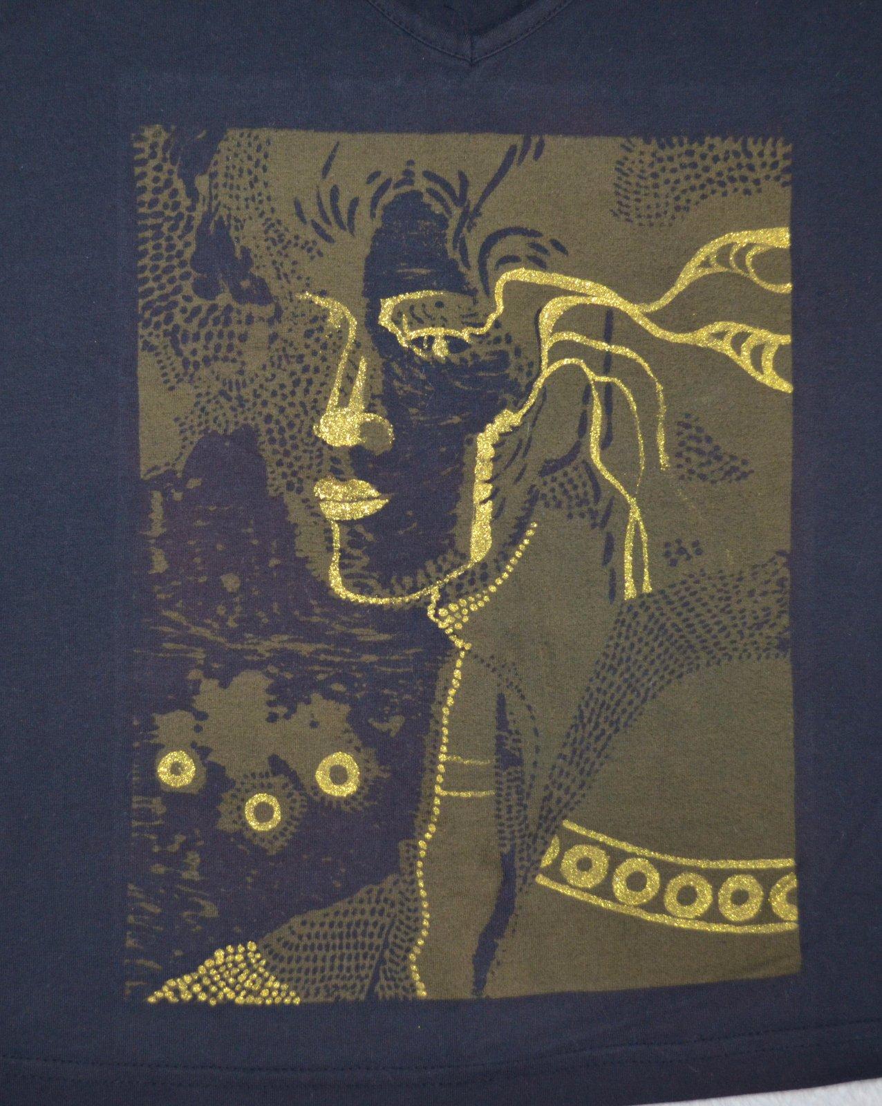 tlač zlatou farbou a domaľovanie detailov zlatou flitrovou textilnou farbou - matricu som si vytvorila z linolea - tlač klasika z výšky ako pri grafikách