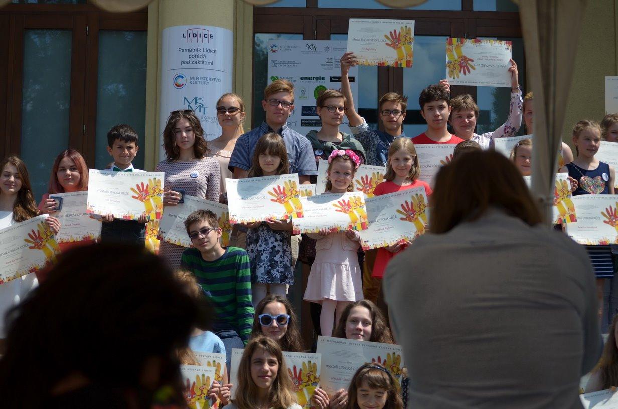 vzadu nad hlavami držia diplomy medailisti z Ruska "School 1955 z Moskvy, Rusko", ktoré boli s nami ubytovaní tiež v Lidickej galérii - nesmierne krásny ľudia - nie len fyzicky, ale s krásnymi prejavmi, pokorou a úctou - ich akvarely boli tak úchvatné, že z toho človeku padá sánka ... pár záberov pridávam v komente