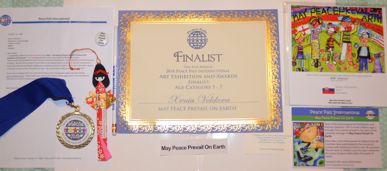finalistka Xenka Volčková - 21. ročníka "May Peace Prevail On Earth" 2018 - dorazila zásielka z USA s medailou diplomom a aj kópiou kresby