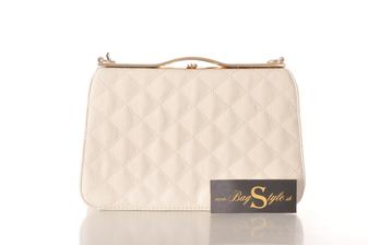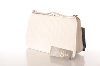 Luxusná listová dámska kabelka s pozláteným lemovaním a prešívaným vzorom . Kabelka uzatváraná z vrchnej časti klipom. Tvar kabelky je pevný . Vo vnútri 2 priehradky oddelené vreckom uzatváraným na zips, po bokoch otvorené postranné vrecká na mobilný telefón a doklady.
