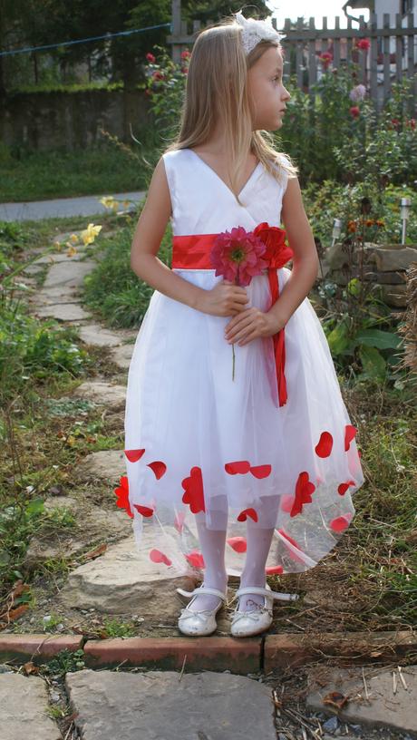 šaty červené lupene, veľ. 98 až 140, cena 25 eur.