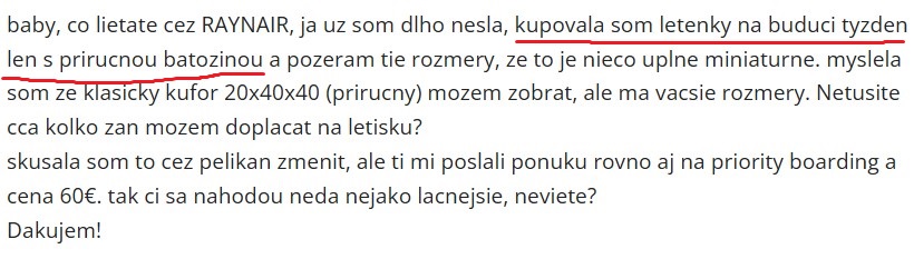 Mozes si dokupit tu vacsiu prirucnu aj na letisku, ale aj ked si budes robit checkin. Zalezi od destinacie, nie do kazdej stoji 20 EUR pri online checkine. Tym, ze nemas kod rezervacie a email k tomu viazany, nemozes robit nic. Oni by Ti mali poslat kod na urobenie checkinu co mozes 24 hodin pred odletom. V zakladnej cene je iba mala prirucna batozina co musis dat pod sedadlo a mozes mat 1 ks. Pocitaj s tym, ze ak si zoberies este kabelku a pod., a budu to kontrolovat, tak to musis dat do tej prirucnej co mas. Ano, niekedy kontroluju.