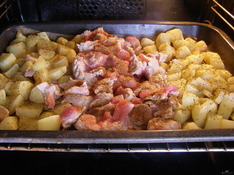 @silesias pokrajane, okorenene, uvarene zemiaky, korenie podla svojej chuti. ja davam sol, mlete, cesnak alebo je zmes korenia kde je toho viac. kuracie masko s paprikou, tiez s tym istym korenim a slaninka. ked sa nebojite kalorii tak aj olejik ;)