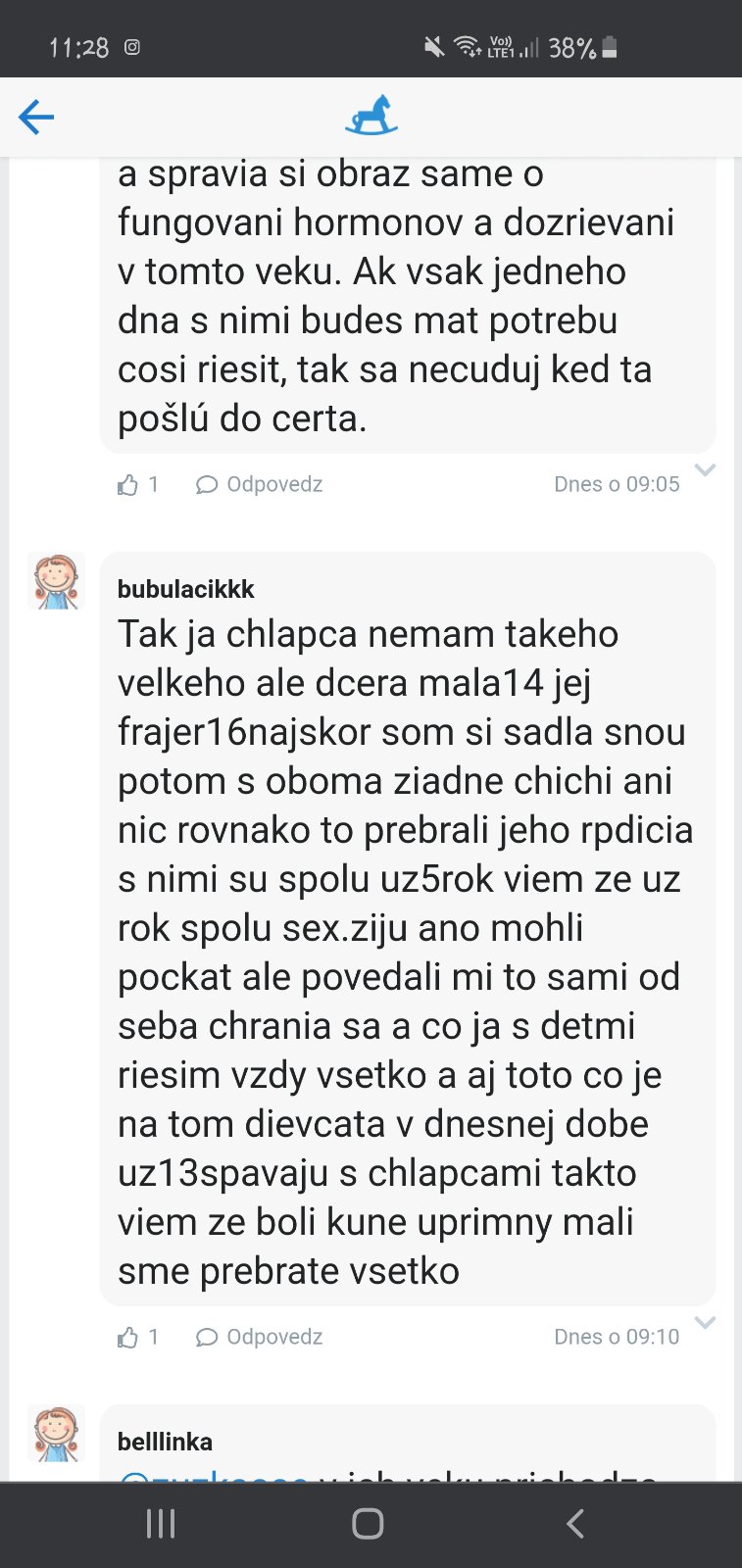 @nistika Nesúhlasím vo vete-,,neovplivníme fakt že 14r dieťa by malo pohl.styk ak sa rozhodne,,...v tomto absolútne nesúhlasím.Ale chápem sú deti ktoré majú kopec voľného času a nevedia čo zo sebou.Nie nezdrala by som ho ako hada..Napíšem také porovnanie detí-mám takmer 12r.syna ráno ide na bus do školy,hneď po vyučovaní ide domov (5min.cesta busom od domu)naje sa,urobí si úlohy a je doma nechodí nikam pretože bývame na dedine kde sú 2ulivmce a vekový priemer 40+ deti v jeho veku tu niesu,len pár škôlkárov alebo všetko už stredoškoláci ktorý tu ani nebývaju lebo sú na intráku čiže nechodí tu von z nikým,maximálne tak zo psom😅alebo s nami.Čiže žiadny čas ani príležitosť nieje,kedže je len doma alebo s nami.Podotkla by som aj že taktiež sme minimum doma,chodíme nonstop niekam na výlety.No a potom sú tu ,,mestské deti,,ktoré žijú napr .takto-príde zo školy domov,rodičia sú v práci dieťa si urobí školske veci a ide von ,stretne sa niekde pred nákupnym centrom zo spolužiakmi/spoluziačkami,fľákajú sa po meste potom si spomenú že jjeeej super máme voľný byt,poďme ku nám😅čiže takéto deti o mnoho viac príležitostí .A ďalšie deti sú napr.také ktoré voľný čas vypĺňaju krúžkami/a majú nosntop aktivity a nemajú čas sa pofľakovať po meste len tak.Nehádzala by som všetky deti do jedného vreca z ostatnými...veľa totiž záleži aj na životnom štýle rodičov/čo ovolia a čo nie/výchove ,ktorú preferujú a takisto aj na samotnom dieťati aké je.Ak by som 14r.dieťaťu dovolila aby sa mi flákalo po meste hocikde a s hocikým do hociakej hodiny tak iné by som ani neočakávala...veľa záleži na rodičoch a aj na samotnom dieťati.