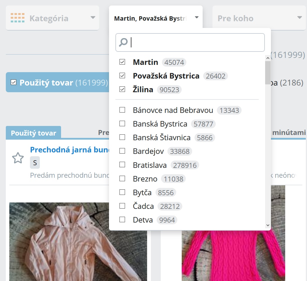 Funguje aj textové vyhľadávanie, najjednoduchšie je zvoliť si z ponuky mesto, v ktorom by si chcela nakúpiť. Je možné zvoliť si viac miest, napr. z blízkeho okolia, kam by sa ti ešte za tovarom oplatilo vycestovať.