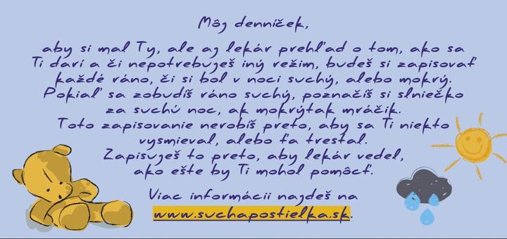 Vďaka odbornej spolupráci s pánom MUDr. Jurajom Kováčikom, primárom pediatrického oddelenia, FNsP Žilina, sme pripravení odpovedať na vaše otázky a pomáhať vám, aby sa vaše dieťa budilo ráno v suchej postieľke.