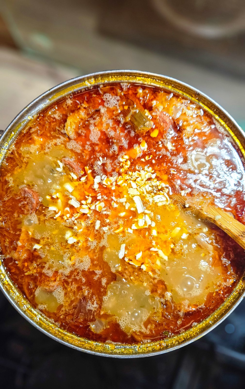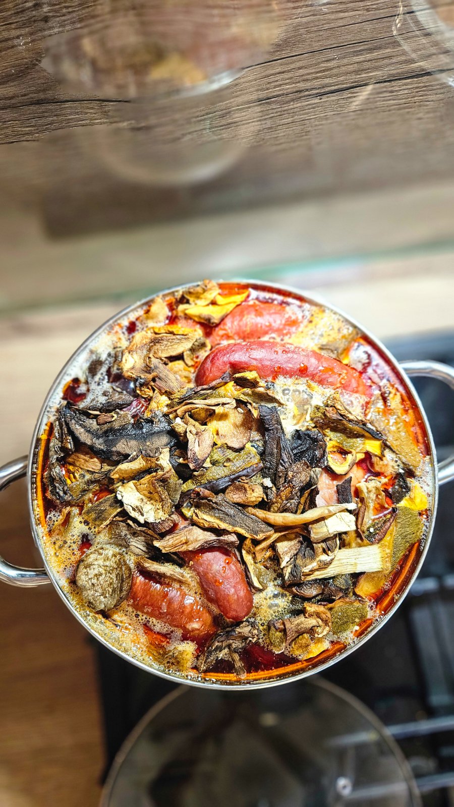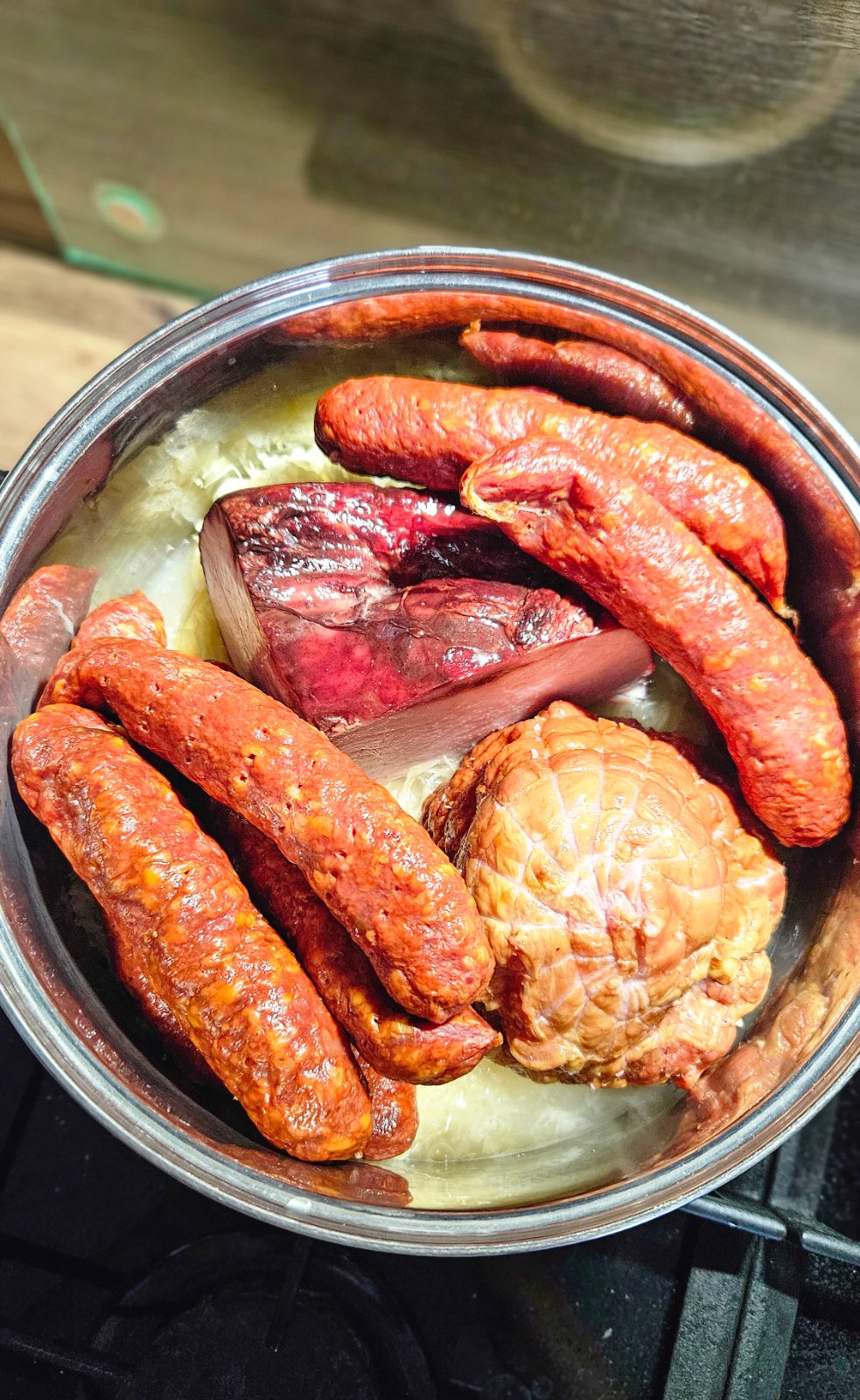 🍖🥩🍄🟫2. Ja dávam údenú šunku, údenú krkovicu do 7l hrnca cca 1.5kg, pridávam v celku do hrnca ku kapuste. Následne pridáme klobásky, ktoré predtým celé dopichám vidličkou, aby dobre pustili šťavu počas varenia, dávam 3-4 druhy cca 800g. Pridám sušené huby, väčšinou dubáky cca 100g alebo podľa chuti. Následne zalejem vodou a varím takto pomaly aj 4-5 hodín na úplne najslabšom stupni.