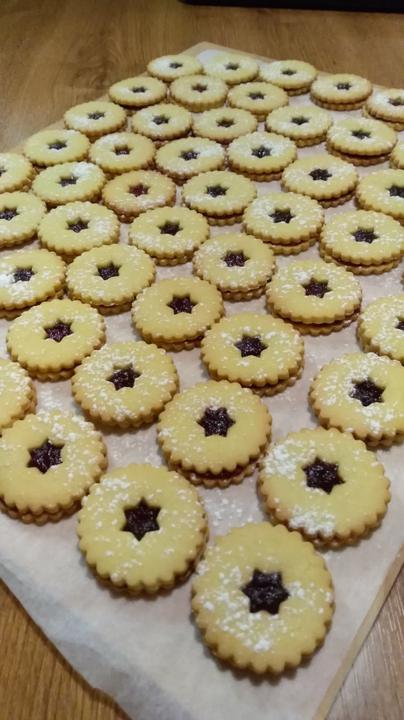 💫3. Pečieme na 180°C cca 7-8 min. Vychladnuté natrieme džemom a zlepíme. Ja ako pomôcku používam cukrárske vrecko, ktoré si naplním džemom a následne nastrihnem špičku a plním, ide mi to tak od ruky a rýchlejšie a nakoniec este posypeme práškovým cukrom cez sitko🫶🏽☃️🤗
