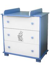 Štýlová drevená komoda s tromi objemnými šuplíky, v krásnej farebnej kombinácii s obrázkom. Táto detská komoda je ideálna na prebaľovanie a prebaľovací pultík je možné podľa potreby posunúť či zložiť. Vyrobené z kvalitného borovicového dreva. Rozmery: 83x43x87cm, s prebaľovacím pultom 83x72x87cm (šxhxv). Rozmery prebaľovací plochy: 72,5 x49, 5 cm.