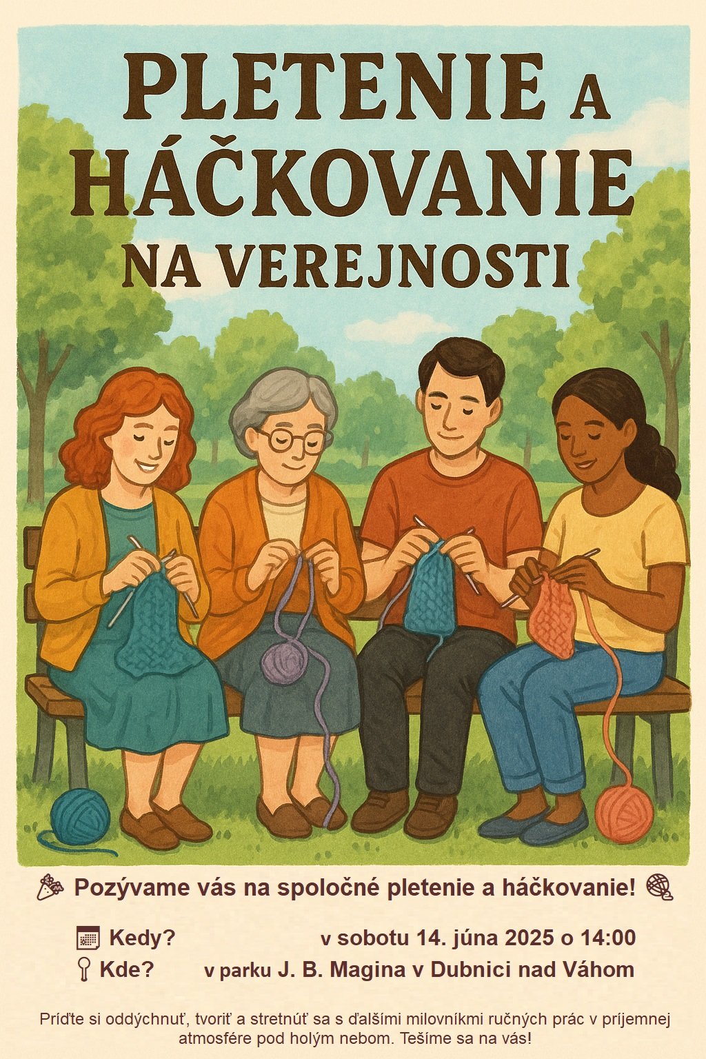 Pozývame vás na Svetový deň pletenia na verejnosti v sobotu 14. júna od 14.00 do parku v Dubnici nad Váhom, kto má blízko, radi vás uvidíme, strávime príjemné popoludnie s pletením a háčkovaním. Prineste si so sebou skladaciu stoličku alebo deku na sedenie na tráve, ako sa vám lepšie tvorí. Teším sa na vás