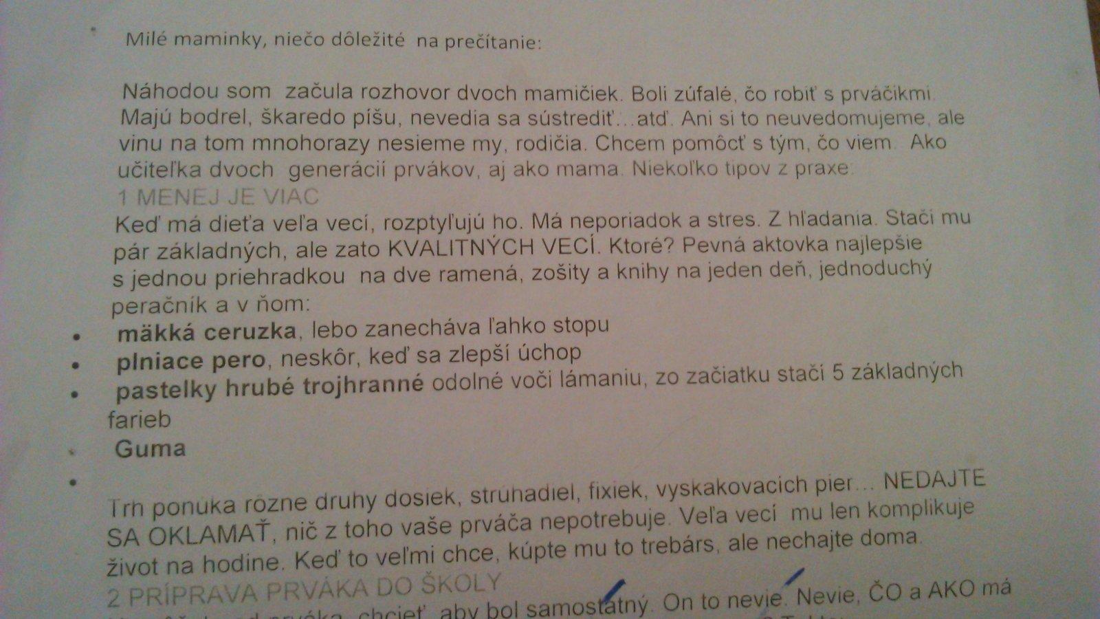 @terezka1947 nam ucitelka poslala list a povedala,ze mu staci ceruza,pero neskor,guma a len zakladne farby-viac nic,zbytocne maju v tom chaos naco.......prvy rocnik im treba ulahcit.