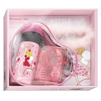 Darčekove balenie - termofľaša alfi princezná 350ml s ozdobami do vlasov (gumičky, štipce) v ružovej krabičke celé zabalené v priesvitnej taštičke v tvare srdca