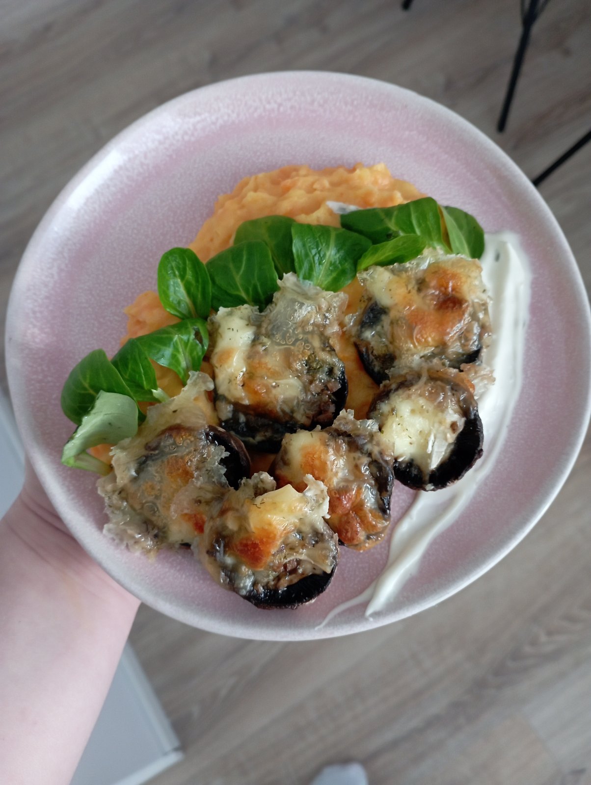 Zapečené šampiňóny s mrkvovo-zemiakovou kašou :)