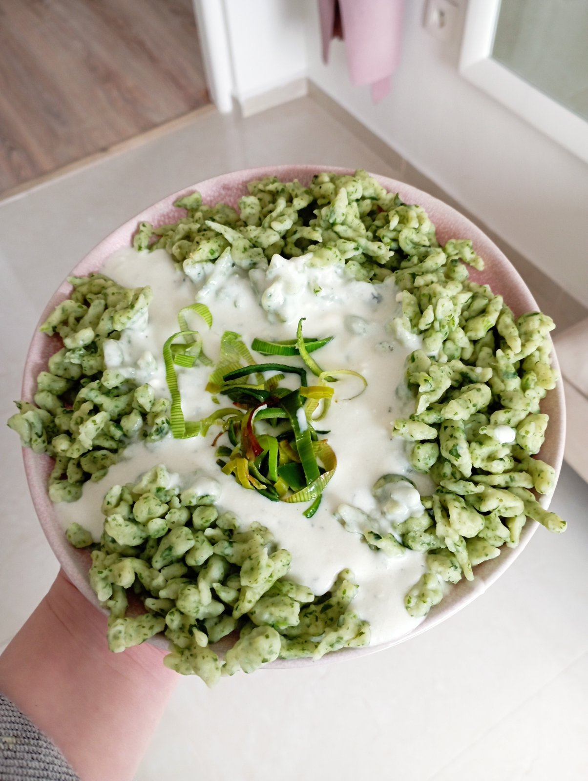 Špenátové halušky s nivovou omáčkou a pórom =)