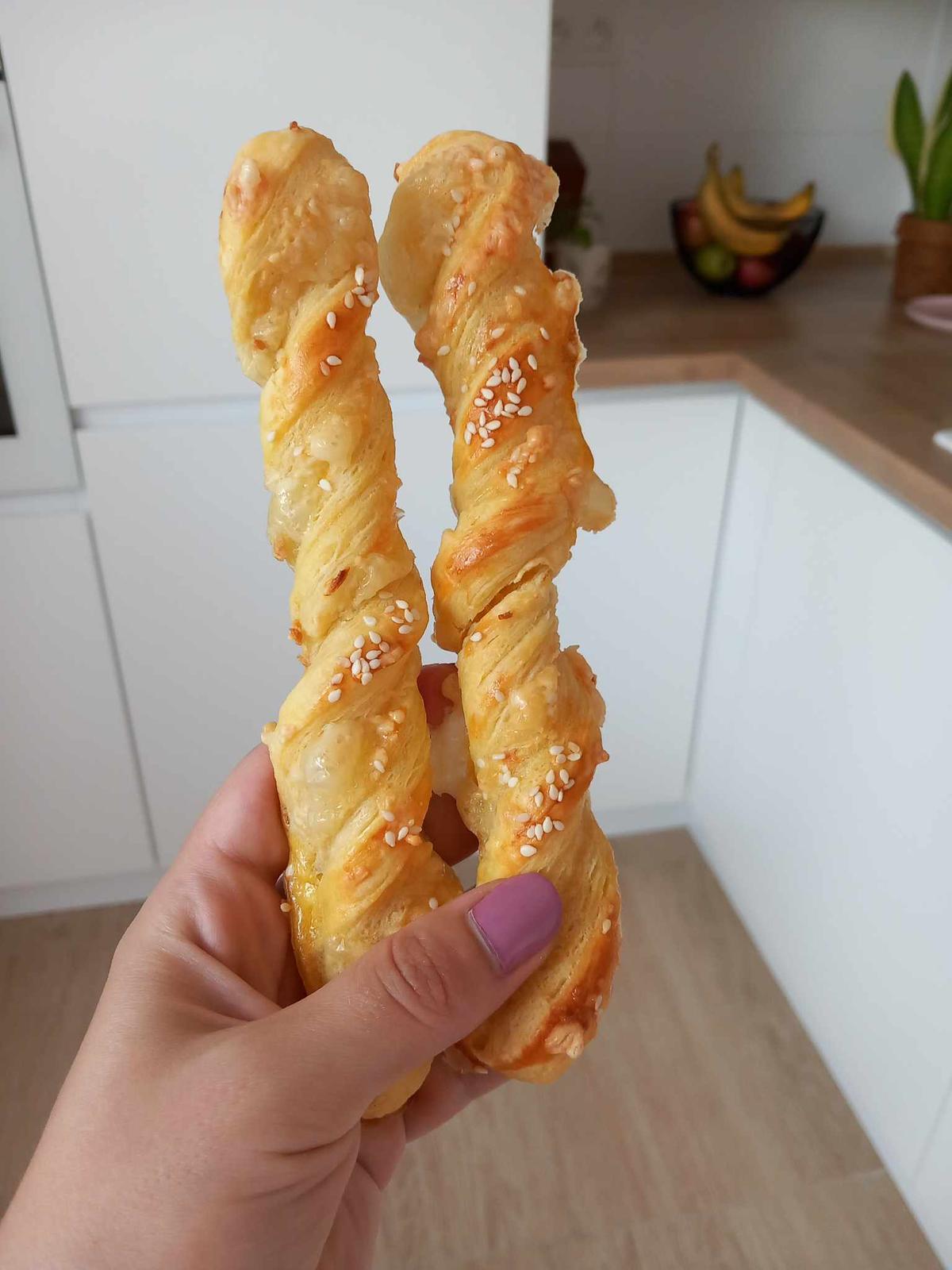 autor@bernette lístkové cesto si rozvaľkáš, potrieš olejom s prelisovaným cesnakom, nastrúhaným syrom a prehneš ho napoly. Nakrájaš si na pásiky, ktoré takto zahneš ako na fotke. Potrieš s rozšľahaným vajíčkom a posypeme sezamom. Dáš upiecť, ja som piekla na 180 stupňovdo zlatista.