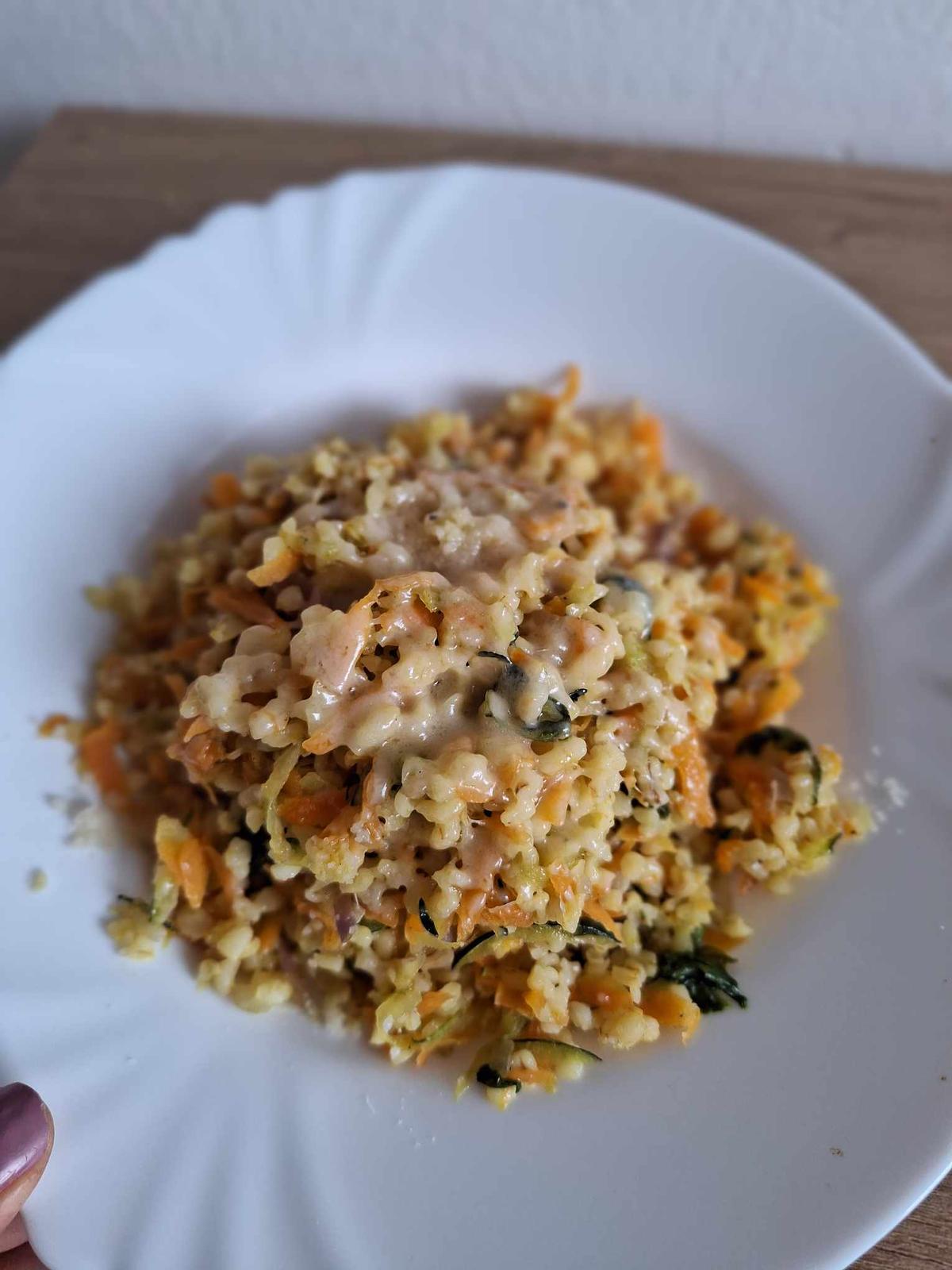 autor@nika_17 to je recept ala čo chladnička dala, len tak od oka. Bulgur som si uvarila zvlášť v osolenej vode. Zatiaľ som na oleji opiekla cibuľku, pridala nastrúhanú mrkvu, cuketu aj so šupkou tiež nastrúhanú. Trošku som opiekla, pred koncom som pridala aj čerstvý špenát nech sa stiahne. Okorenila som... peper, červená paprika a trošku kurkumy. Spojila som to s uvareným bulgurom a prisypala som aj trošku syra strúhaného.