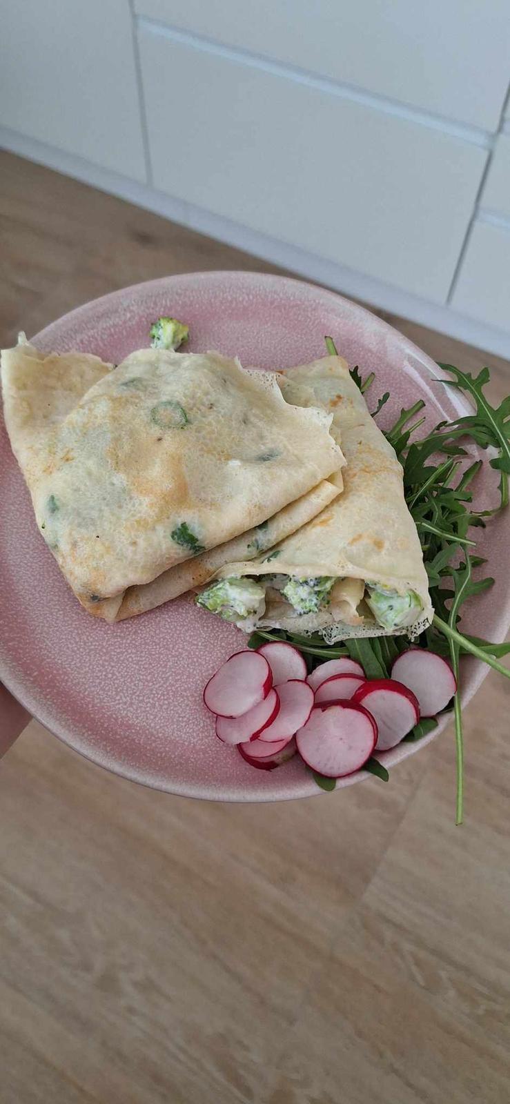 Palacinky na slano: v cestičku pridaná jarná cibuľka a plnka brokolicová s kyslou smotanou, syrom a korením.