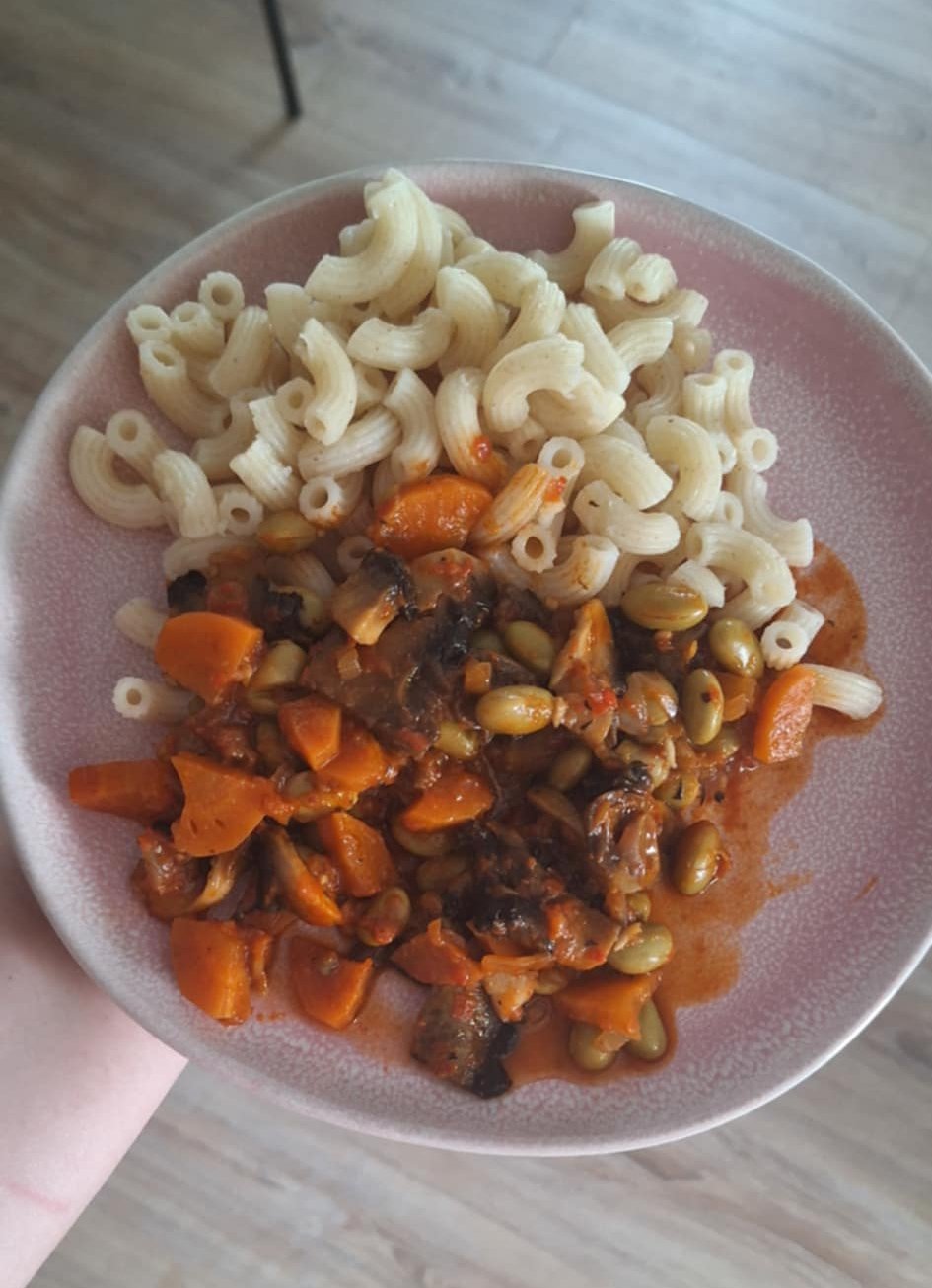 Huby Portobello s Edamame sójovými bôbmi s mrkvou a ajvarom.