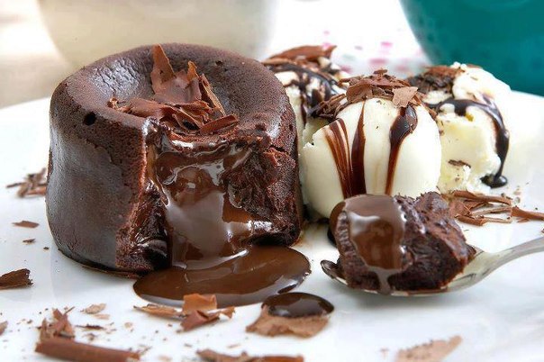 Vo vodnom kúpeli rozpustíme čokoládu, primiešame maslo, odstavíme a necháme vychladnúť. Potom pridáme vajcia, žĺtky a vyšľaháme na jemný krém, do ktorého postupne primiešame múku. Vymiešame na hladké cesto, ktorým plníme vychladené formičky a pečieme vo vyhriatej rúre 10 až 12 minút. Po dopečení necháme asi 1 minútu vychladnúť a podávame na tanieri.
