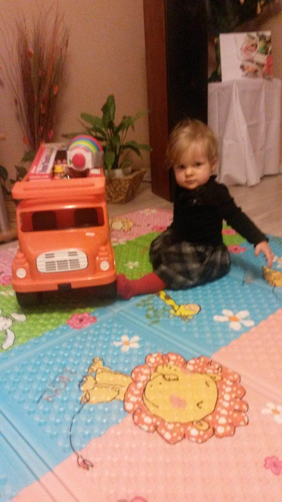 Tatrovku, v Tesco sme kupovali také hasičské auto s náradím, hra, svieti, drevenú zatlkacku, loď so zvieratkami, po stlačení zvieratka každé vydá svoj zvuk, Fisher pricestoval vláčik, traktor s vlečkou plnú zvieratiek, tiež hra, s týmto sa nás ročný najradšej hrá