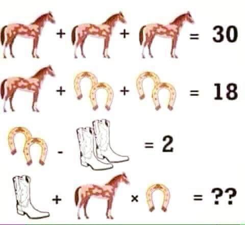 Caveste zienky moje, aj ja som si vcera najskor myslela, ze je to 42 (nemoze to byt 48, kedze nasobenie ma prednost pred scitovanim), ale ale, chybicka se vloudila a moj mozog nespracoval informaciu, ze v poslednom riadku je cizma len JEDNA, ako aj podkova je len JEDNA 🙂