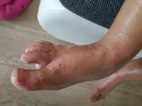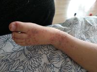 Foto pre slabšie povahy radšej do komentu... 3dni - 3doktorky - 3diagnozy... Prvá povedala, že ide o hnisavu angínu spojenú s prepuknutím ekzému, keď som sa jej pýtala na piatu a šiestu chorobu, tie vylúčila. Anginu určite nemá, 1den mal 40tky, ale keď to kleslo, napapal sa trošku, hrdielko ho neboli, crp žiaľ neurobila a capla ATB na mandle. Druhá MUDr vyhodnotila stav ako šiestu chorobu... Tretia dnes ako stafylodermia... Podľa mňa je to Ruky, nohy, ústa, dnes po 3dnoch sa to vyhodilo aj trošičku okolo úst a na spodku chodidiel. Inak to má vsade, okrem miest, kde máva ekzém, keď mu vystúpi. Ako mu pomôcť? Už to má popraskané, zaschnute, praská to, krváca ;( Hypermangan, summamed, fenistil, zodac, masť od koznej a zinkovy olej - toto všetko máme. O 2mesiace bude mať 2roky.