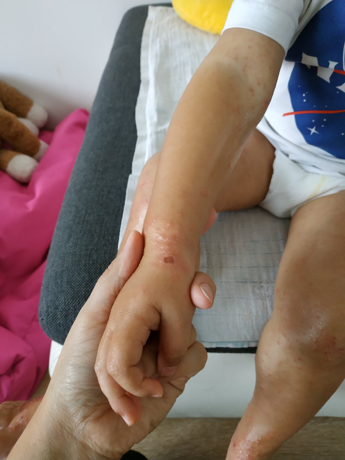 Foto pre slabšie povahy radšej do komentu... 3dni - 3doktorky - 3diagnozy... Prvá povedala, že ide o hnisavu angínu spojenú s prepuknutím ekzému, keď som sa jej pýtala na piatu a šiestu chorobu, tie vylúčila. Anginu určite nemá, 1den mal 40tky, ale keď to kleslo, napapal sa trošku, hrdielko ho neboli, crp žiaľ neurobila a capla ATB na mandle. Druhá MUDr vyhodnotila stav ako šiestu chorobu... Tretia dnes ako stafylodermia... Podľa mňa je to Ruky, nohy, ústa, dnes po 3dnoch sa to vyhodilo aj trošičku okolo úst a na spodku chodidiel. Inak to má vsade, okrem miest, kde máva ekzém, keď mu vystúpi. Ako mu pomôcť? Už to má popraskané, zaschnute, praská to, krváca ;( Hypermangan, summamed, fenistil, zodac, masť od koznej a zinkovy olej - toto všetko máme. O 2mesiace bude mať 2roky.