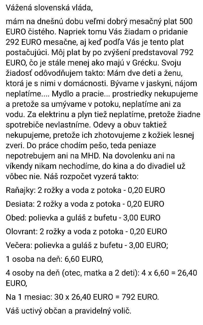 @tinka.binka práveže čítali... Chápem, že to malo byť akože vtipné, ale obávam sa, že nie je. Skôr taký trápny pokus o vtip. Hlavne v časoch, kedy 500€ mesačne je smutná slovenská realita a ľudia z toho dokážu zázraky a vôbec nežijú v jaskyni a nepijú vodu z potoka.