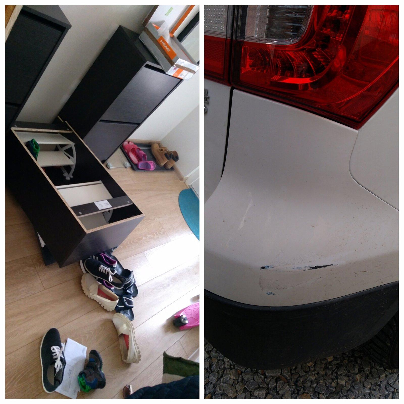 Tak dnes deň blbec, keby mi niekto povie, že je 13teho, tak mu uverim!!! Ráno som bojovala s malou, nech si oblečie pančuchy do škôlky, ale keď ona nechceeeeee... Na obed prikvacila malého skrinka;( A to som stála nad ním!! Bože tieto skrinky z Ikei MUSIA byť prichytene o stenu... Ešteže to padlo na topánky, čo z nej vypadli, tak to trochu stlmilo pád a bábätko je ok, teda dufam, trošku si buchol chrbatik 😯 Moje Bobo malinkate ;( No a keď sme išli pre Adelku do škôlky, takýto pozdrav nam nechalo nejaké modré auto na tom nasom ;( Ale kašlem na celé auto, aj keď nemá ani rok, to ale ani ten náš drobček malý, hlavne nech je ten ok... Jaj dievcence, dávajte pozor na deticky svoje, tak málo stačí a môže sa stať veľmi zle ;(