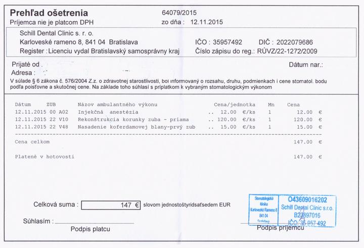 #schill - Transparentosť je pre Schill Dental Clinic veľmi dôležitá, preto pacient presne vie za čo platí - po ošetrení dostáva doklad s presným rozpisom výkonov a cenami. Na doklade z môjho dnešného ošetrenia môžete vidieť ako to v praxi vyzerá.