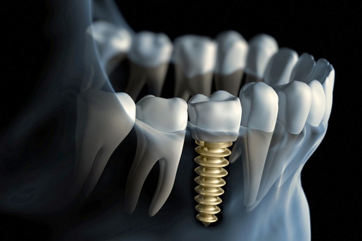 Je to umelý koreň, ktorý sa umiestni do kosti a drží náhradný zub, alebo mostík. Vyzerá ako skrutka, ktorá sa môže použiť do hornej a dolnej čeľuste. Je vyrábaný z titania, alebo iných materiálov vhodných pre použitie v ľudskom tele. Implantáty sú fixované v kosti, aby poskytli stabilnú základňu pre jeden, alebo viac náhradných zubov nazývaných korunky alebo mostíky. Umožňujú lepšie žuvanie, artikuláciu a vzhľad. Na rozdiel od umelého chrupu, implantáty sú trvalo vsadené a netreba ich na noc vyberať.