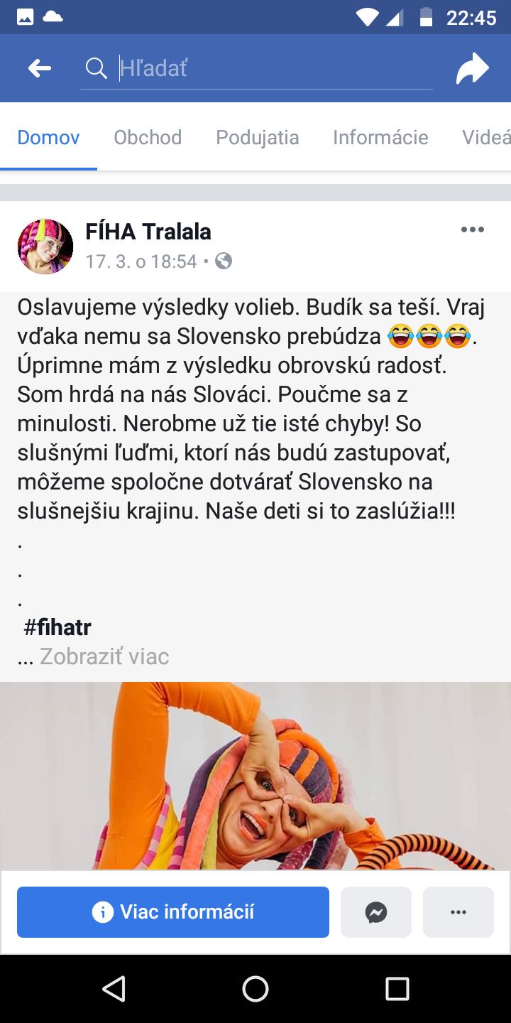 Myslim, ze nejde o to, koho Fiha volila, ako skor o princip. Zverejnila to na profile Fihy, nie na svojom sukromnom a ja tiez ako mnohe tam, nesuhlasim s tym, aby sa do detského sveta miesala politika. Ruku na srdce, hoci FB je od isteho veku, mnohe deti na jej stranku chodia. Nemyslim, ze je spravne a vychovne, aby do zivota deti vstupovali volby formou, kto koho volil. Ano, som za to, aby starsie deti boli informovane o diani sa v okolitom svete, o tom, co su volby, kto a preco voli, ale som zasadne proti, aby medialny vzor takymto sposobom ovplyvnoval deti a vsuval im do ich sveta vlastne politicke presvedcenie. Fiha je vychovno-umelecky projekt a v tomto pripade (politicky status) urobila nieco, co je v rozpore s jej ideou.